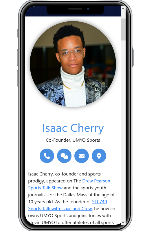 Isaac Cherry, co-founder and sports prodigy, appeared on The Drew Pearson Sports Talk Show and the sports youth h=journalist at the age of 11 years old. As the founder of STI 740 Sports Talk with Isaac and Crew, he now co-owns UMYO Sports and joins forces with Stevin UMYO to offer athletes of all sports the tools to use their talent, name, and likeness to generate additional funding and long-term opportunities.